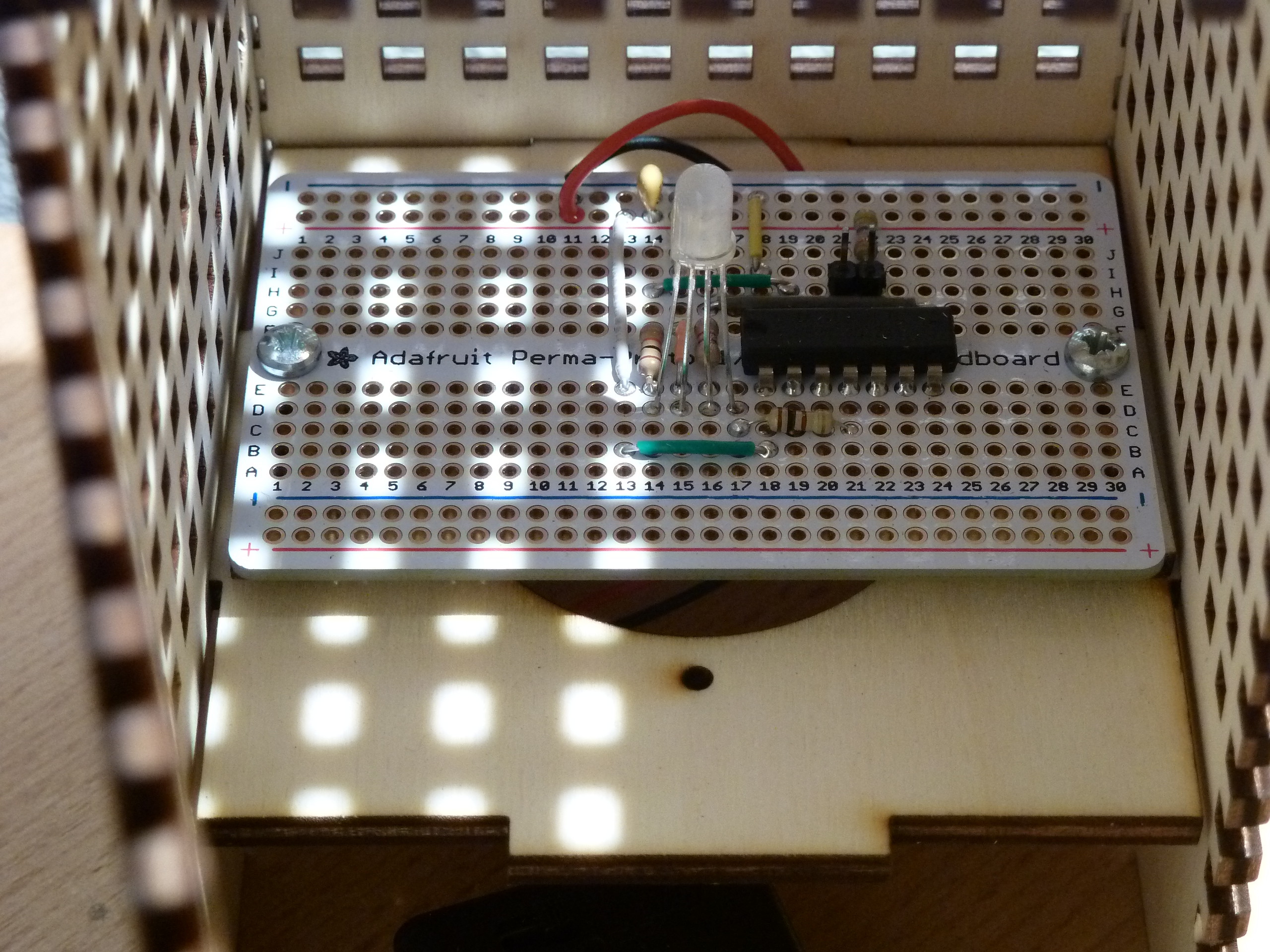 - Que les LED RGB translucides sont très nettement moins lumineuses que les transparentes. J’utilise une LED translucide dans ce projet, mais j’ai un gadget similaire avec une LED transparente et la différence est frappante. J’aurais aussi dû être moins conservatif sur la question de la consommation et utiliser des résistances plus faibles.