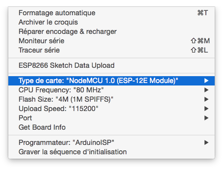 Note : Adafruit et LoLin proposent d’autres gestionnaires. J’ai choisi la version de la communauté qui maintient le site esp8266.com. La version d’Adafruit est un fork de celle d’esp8266.com.