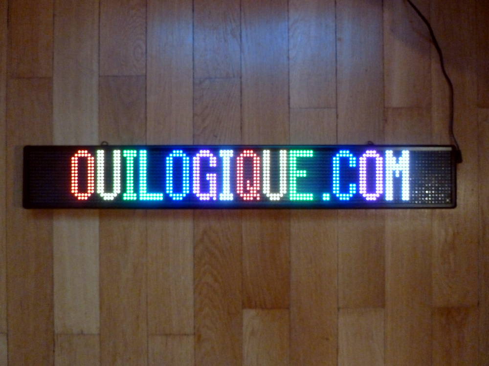 Si aucune couleur n’est spécifiée, les caractères s’affichent dans 7 couleurs successivement : (rouge R, jaune Y, vert G, cyan C, bleu B, mangenta P, blanc W)