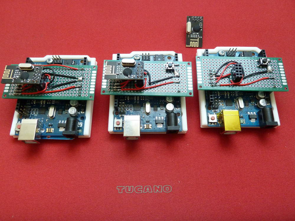 Le bouton sur les shields est connecté à la broche A0. Le brochage du nRF24 est disponible dans le tableau ci-dessous. Il faut connecter un condensateur électrolytique de 3.3 µF à 10 µF en parallèle sur l’alim (pas visible sur l’image).