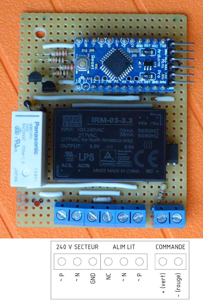 Cette commande à relai est utilisée pour alimenter un lit électrique avec commande 9 V dans les mains de l’utilisateur. L’idée est d’amener le 240 V jusqu’au lit uniquement quand l’utilisateur actionne les moteurs. Ainsi il ne passe pas ses nuits avec du 240 V dans le dos. D’origine, le lit était livré avec un système à relai qui a cessé de fonctionné, probablement à cause de l’instabilité de la tension de commande. Et comme ce modèle n’existe plus depuis belle lurette, j’ai décidé d’en construire un nouveau.