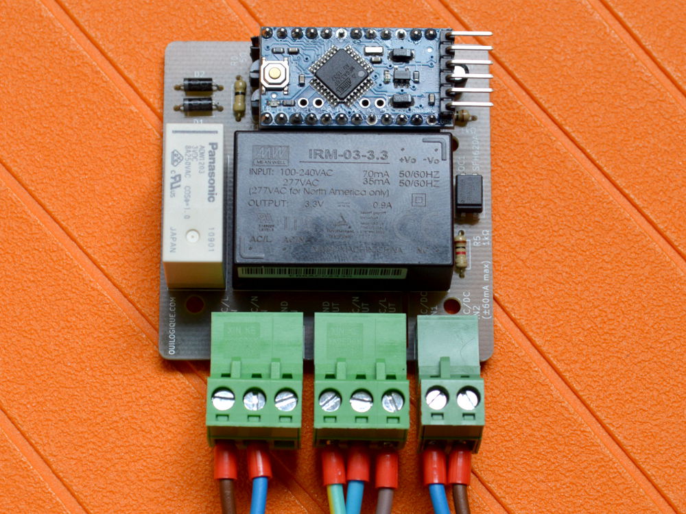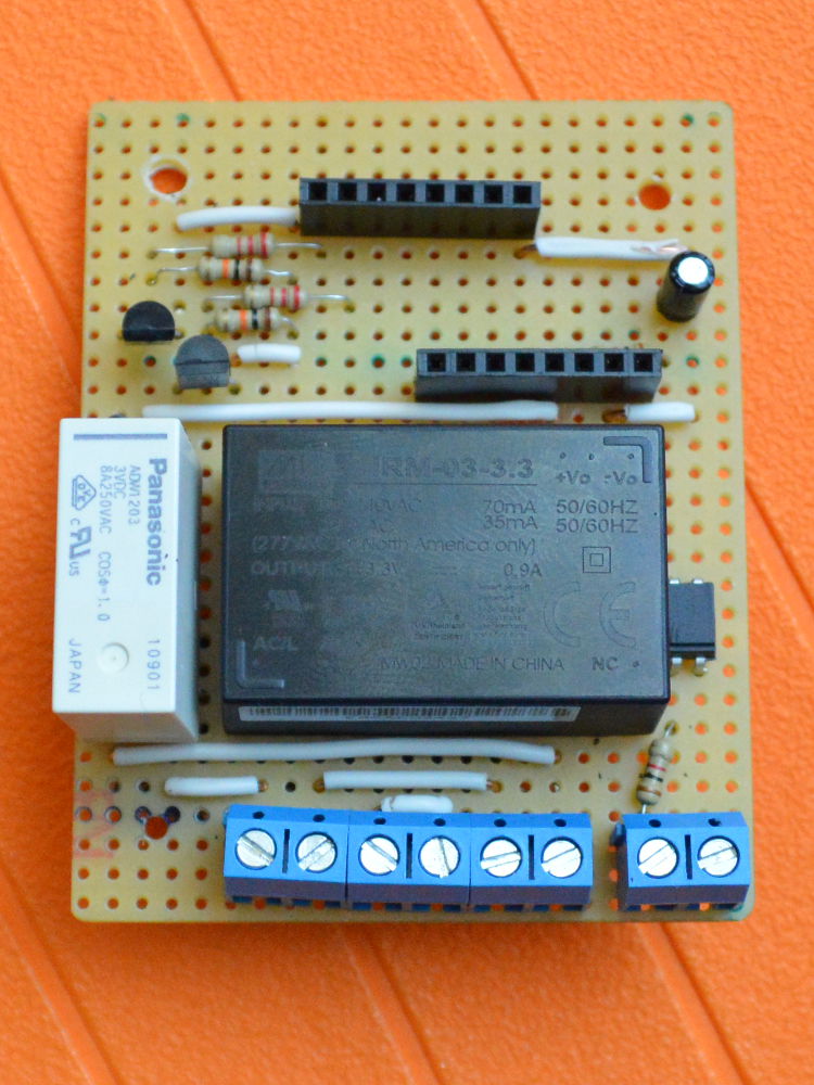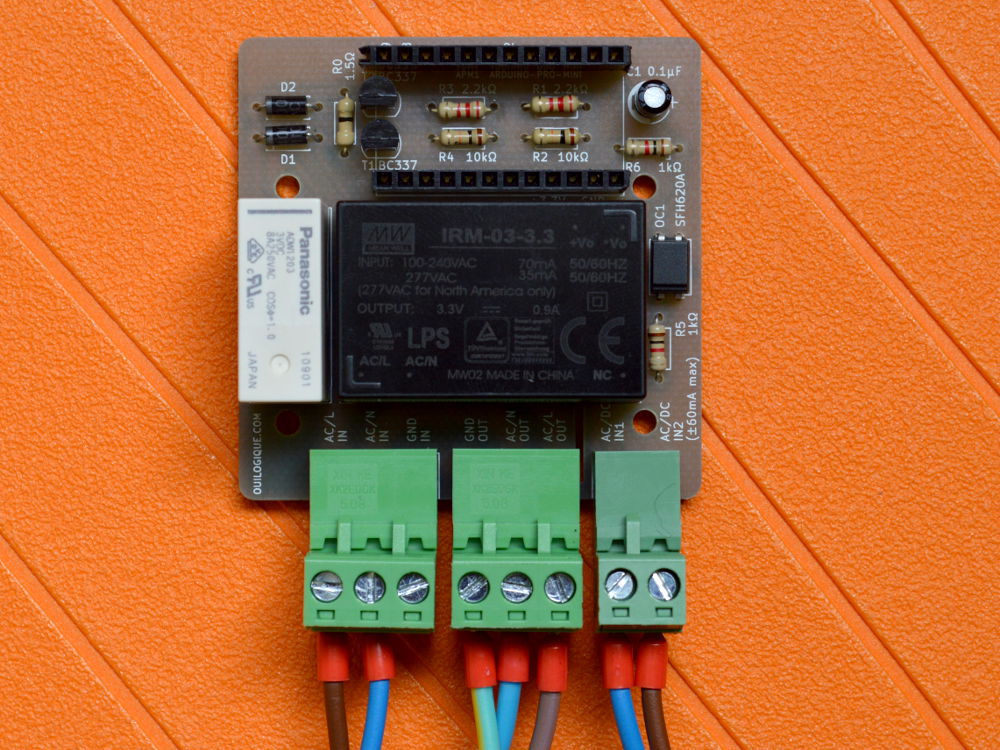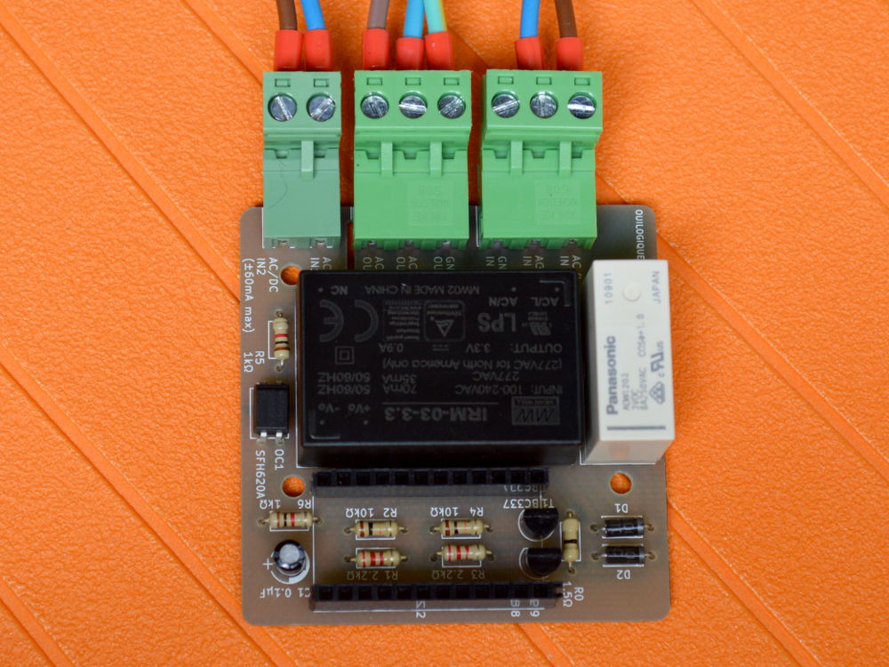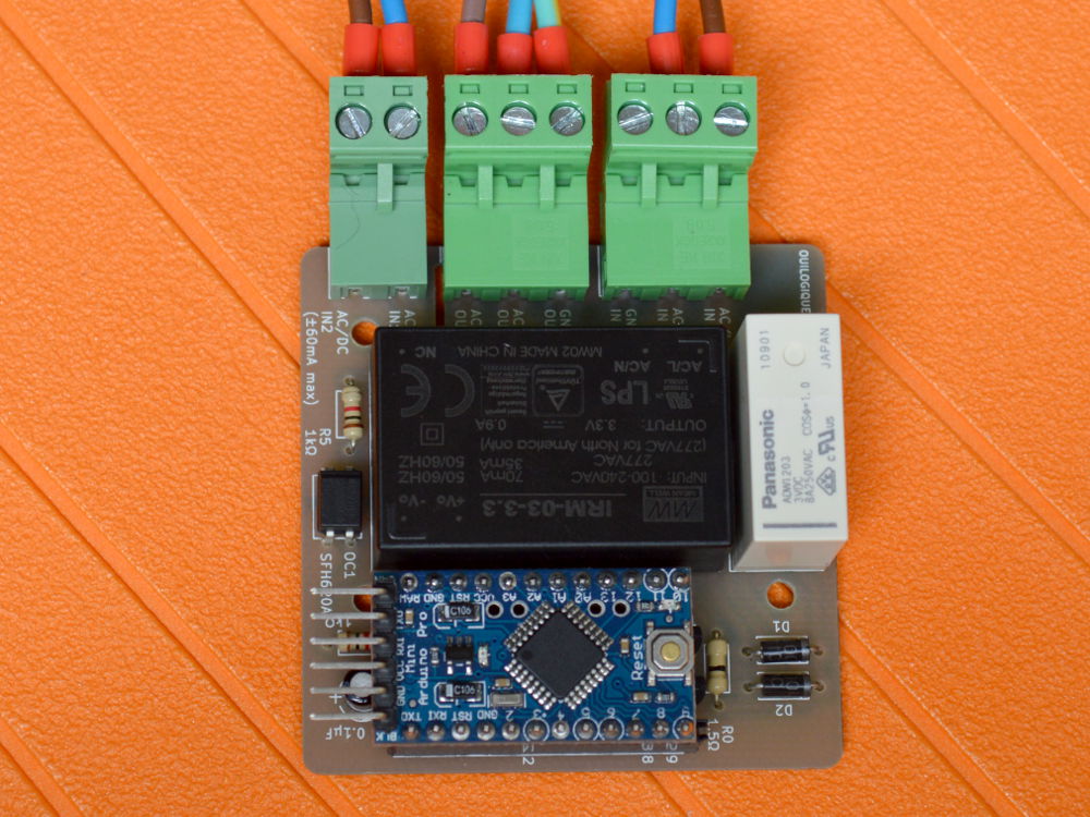 Le tout premier prototype était basé sur un Arduino UNO avec deux relais solid state, un pour la phase et l’autre pour le neutre. J’ai préféré la solution avec relai bistable pour le deuxième proto (ci-dessus), pour assurer la séparation galvanique. Le relai bistable a aussi l’avantage de ne consommer que lors des commutations. Comme il ne commute que la phase, j’ai utilisé un cordon 240 V avec une prise à 3 broches pour être sûr que c’est la phase qui est connectée au relai (et pas le neutre).