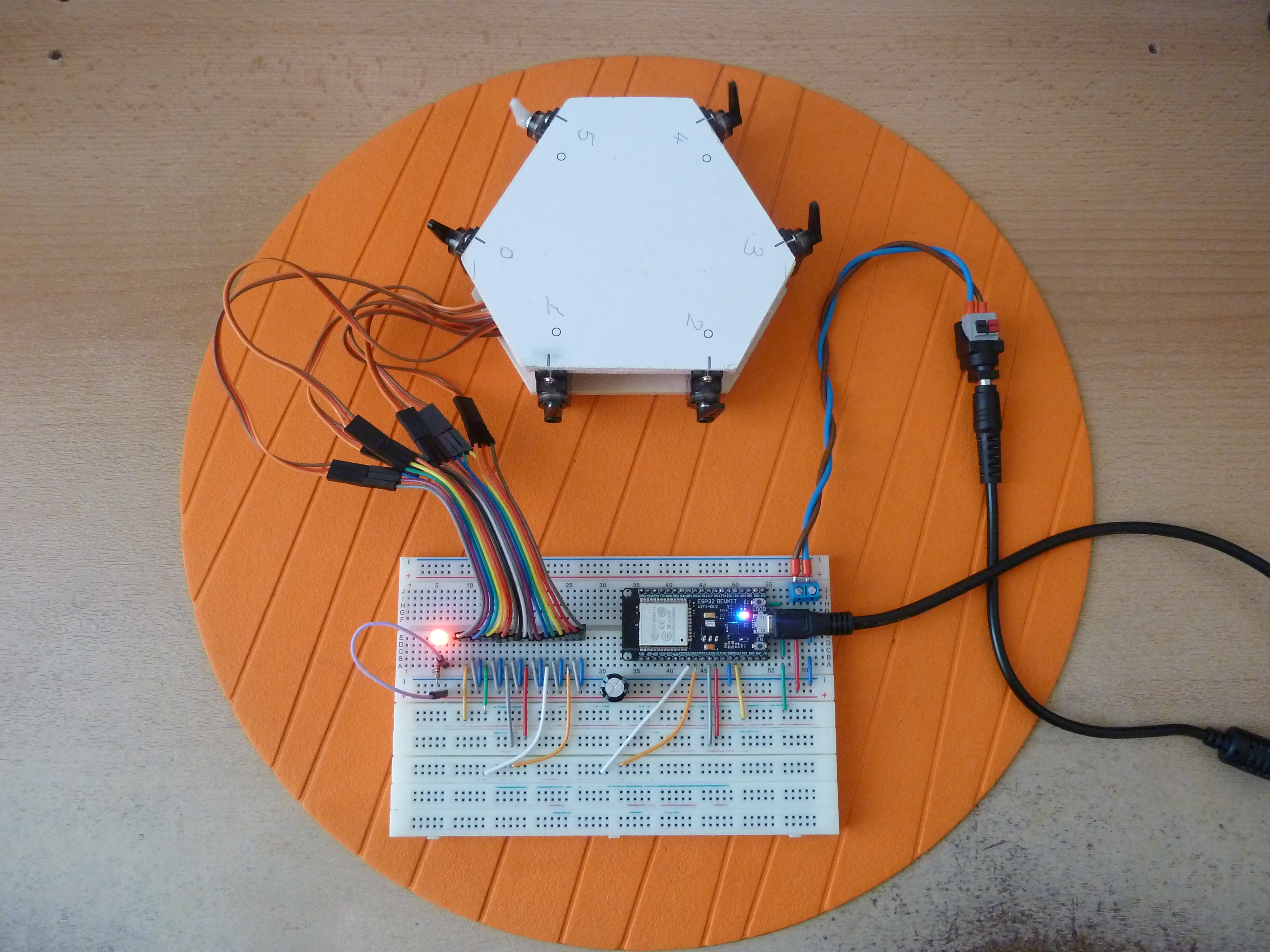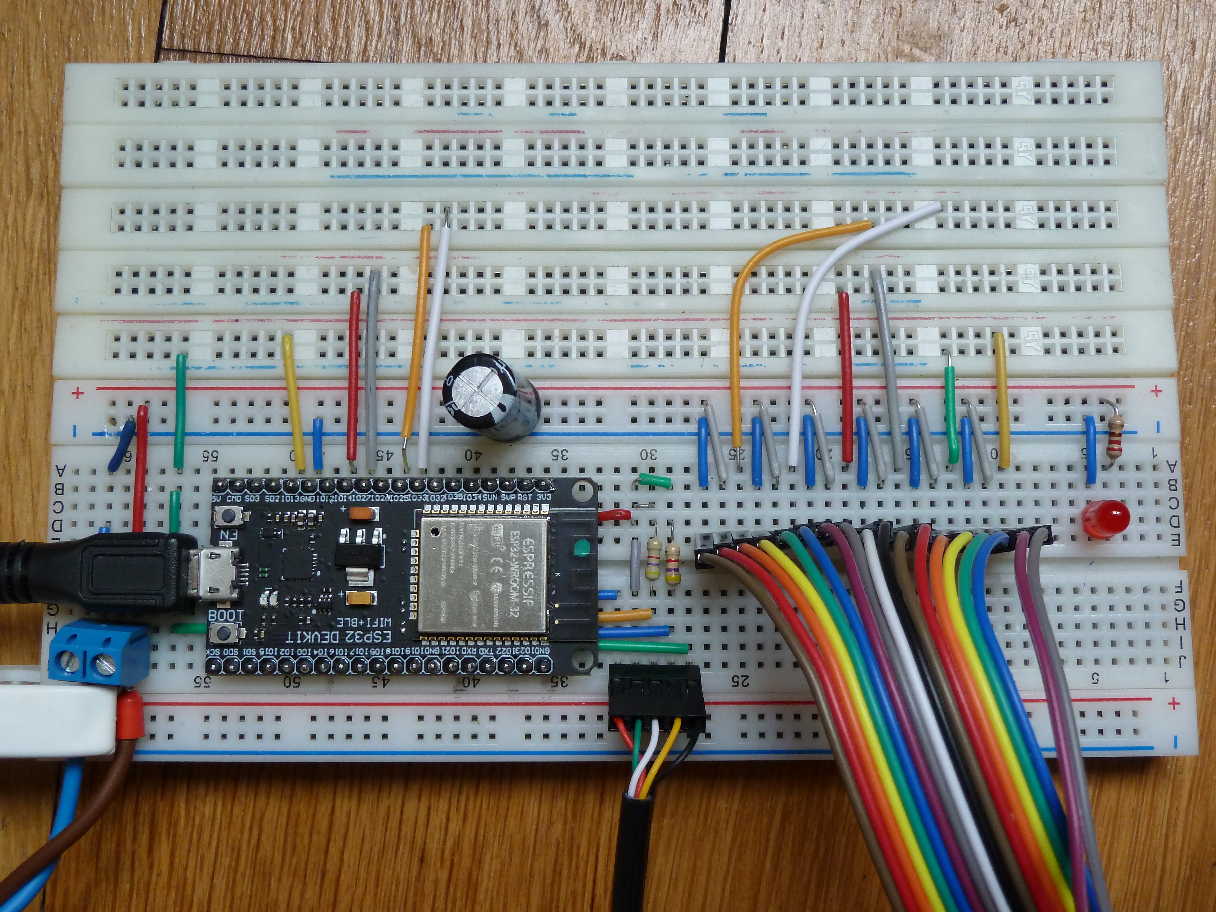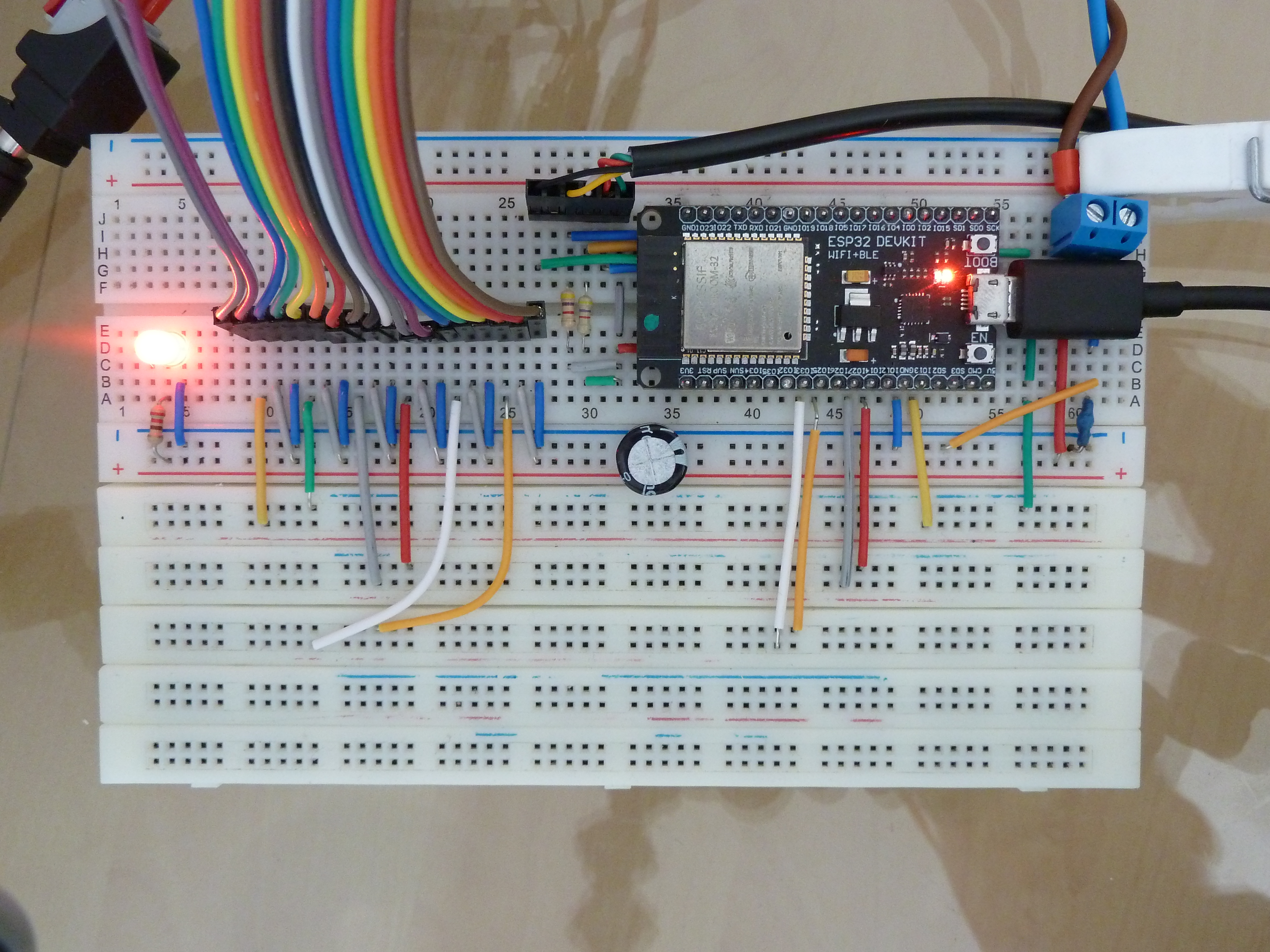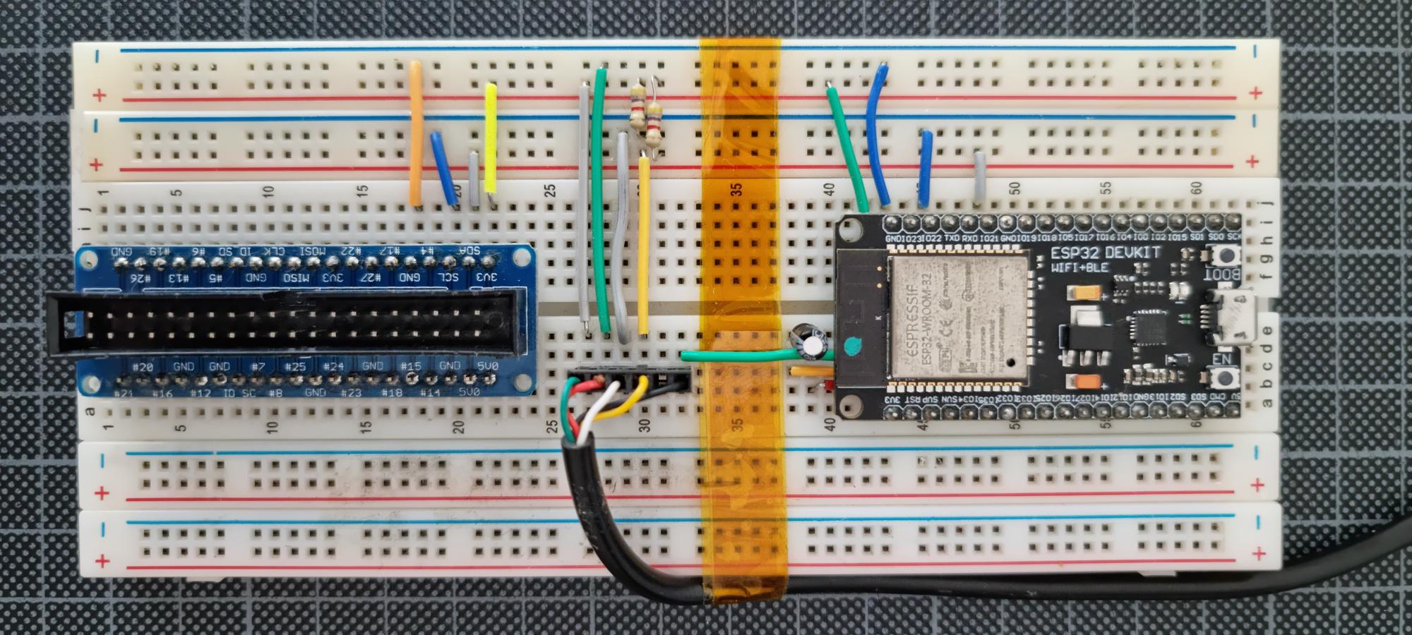 Changement de bande adhésive pour tenir le câble du Nunshunk et ajout d’un condensateur de 10 µF entre la broches RST et GND qui permet de ne plus être obligé de presser sur BOOT lorsqu’on flashe l’ESP.
