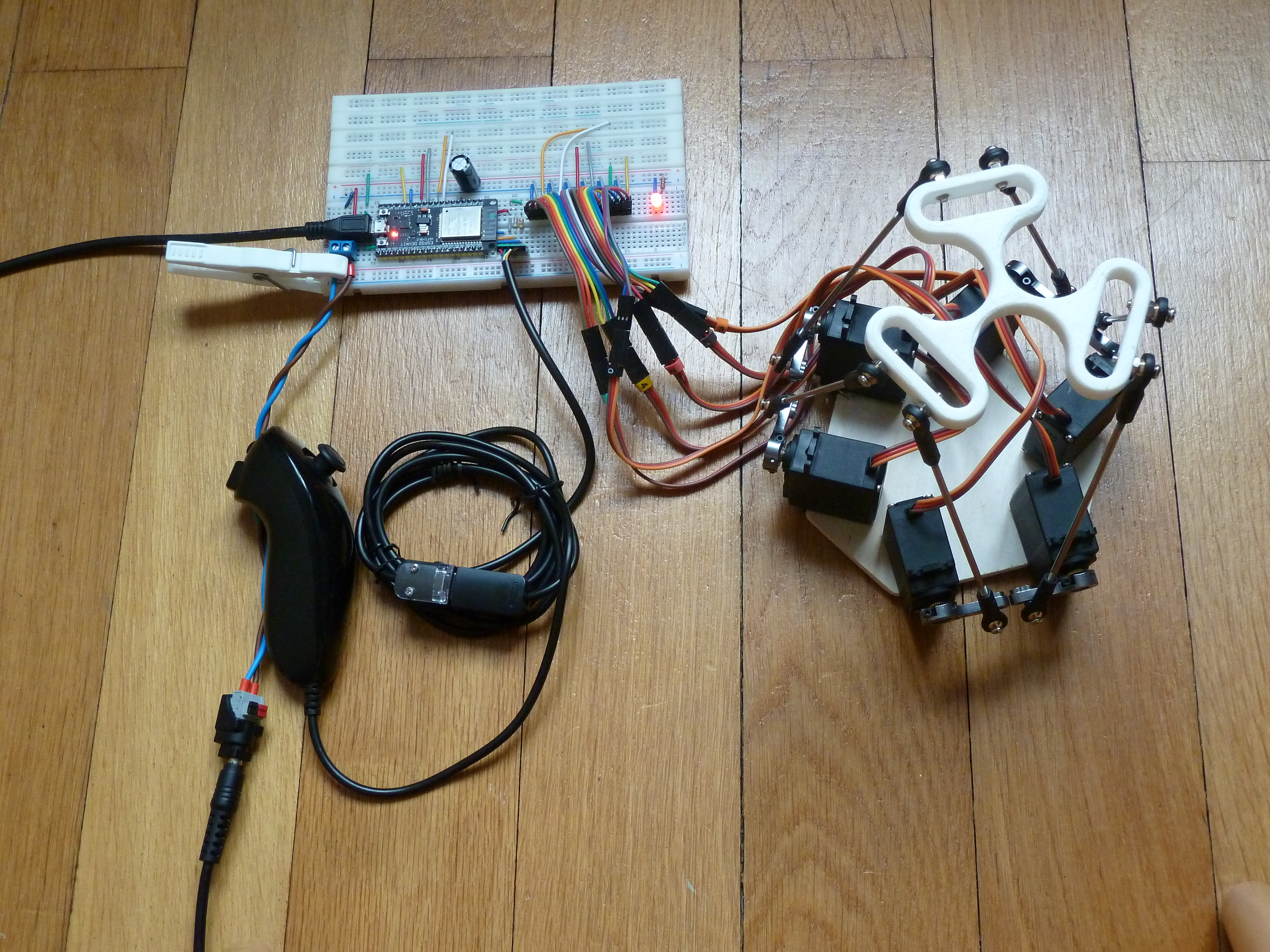 Avec un clone de Nunchuck (joystick I²C de la console Wii), des vraie biellettes et des clones de servos Tower Pro MG996R.